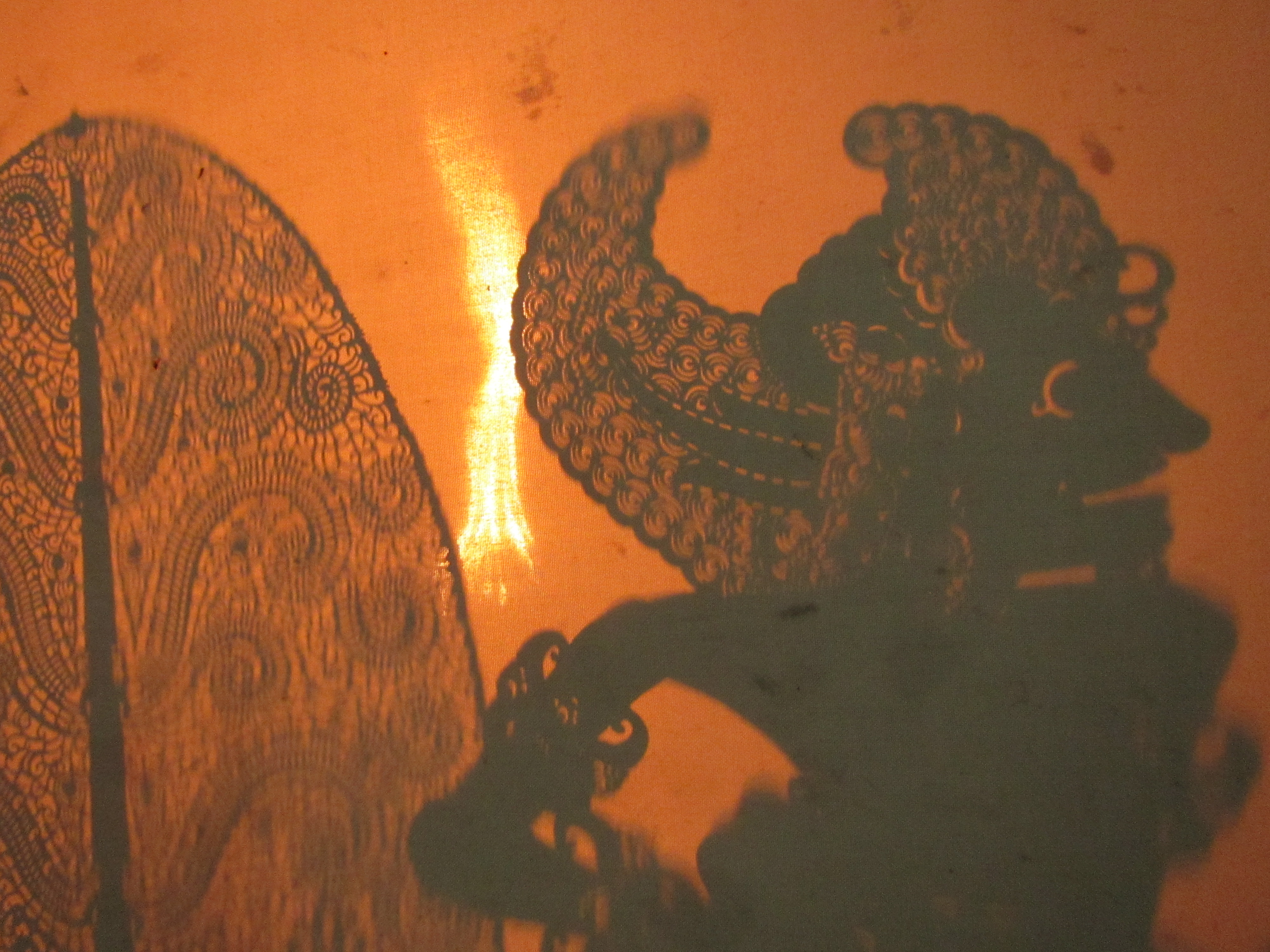 There’s a long list of artistic and cultural places we want to go and things we want to do here in Ubud: art classes, dance performances, museums, and more. The Private Eye has, since her making a large parade-style puppet last year, been very interested in puppetry. Shadow puppetry is an art form here, called Wayang Kulit, so we made Sunday night’s venture to go to a show. There was a simple sheet, with a torch behind it. You could see where, over decades, the torch has sooted the ceiling black and eroded the plaster a bit. The puppetmaster was 80 years old, and had several assistants. The show we saw told the story of the Sacrifice of Bima, where Bima offers himself as a sacrifice to a demon to appease it and save a kingdom, then defeats it in battle.