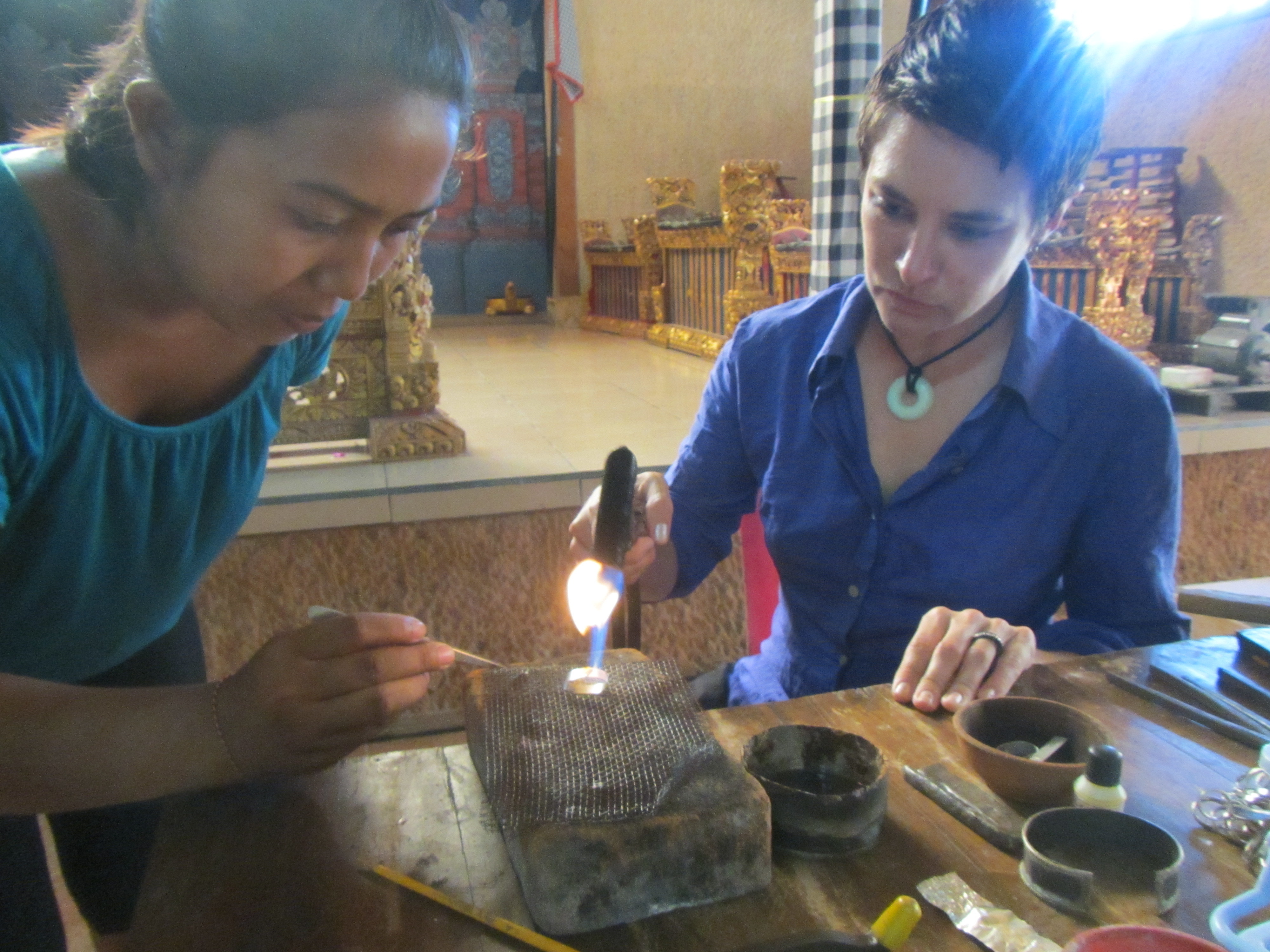 You then dab some solder around the pieces and heat the ring, replacing the glue with metal. To heat the rings, Anna had a foot pumped propane torch. Very simple, but it works!