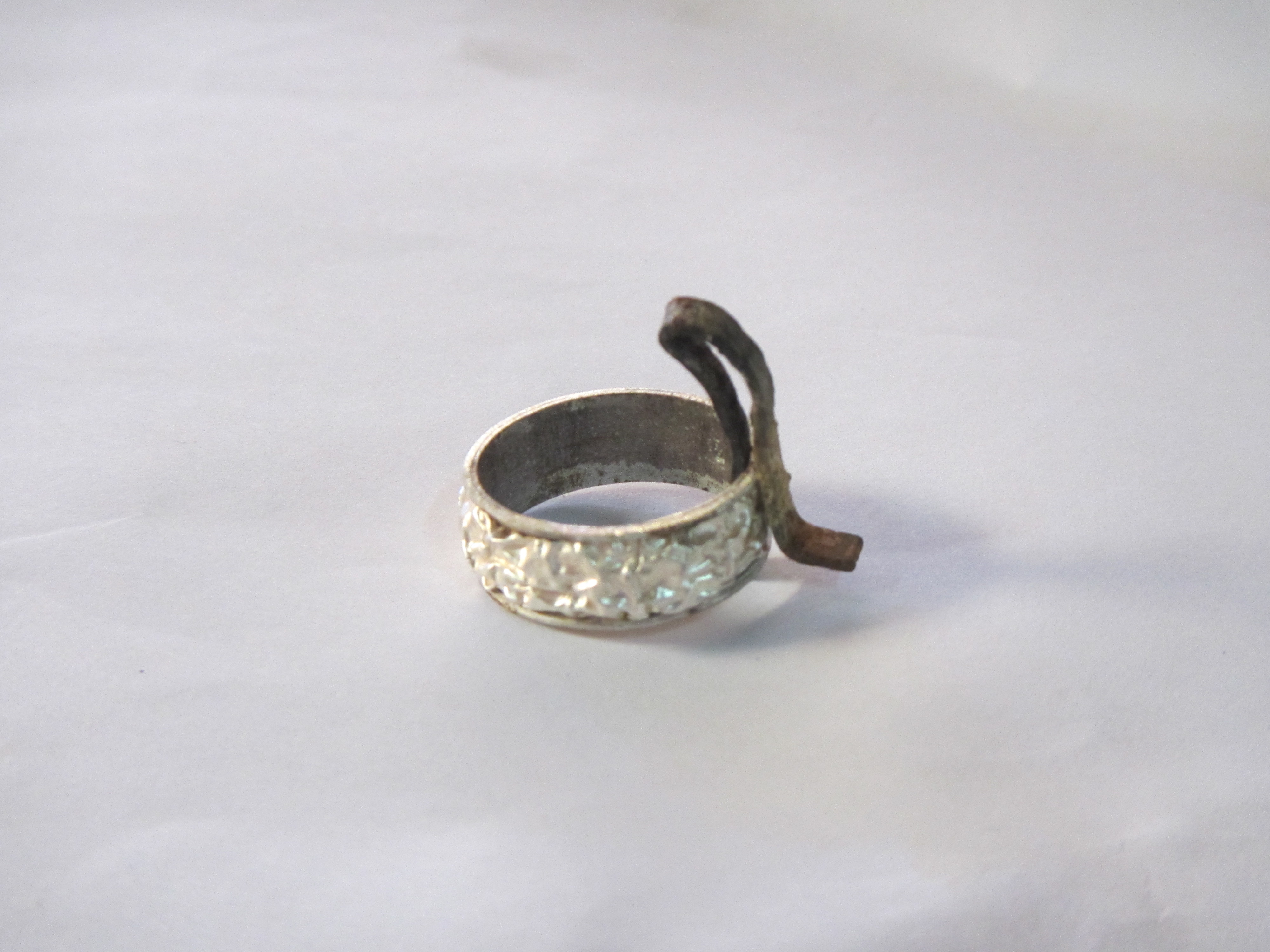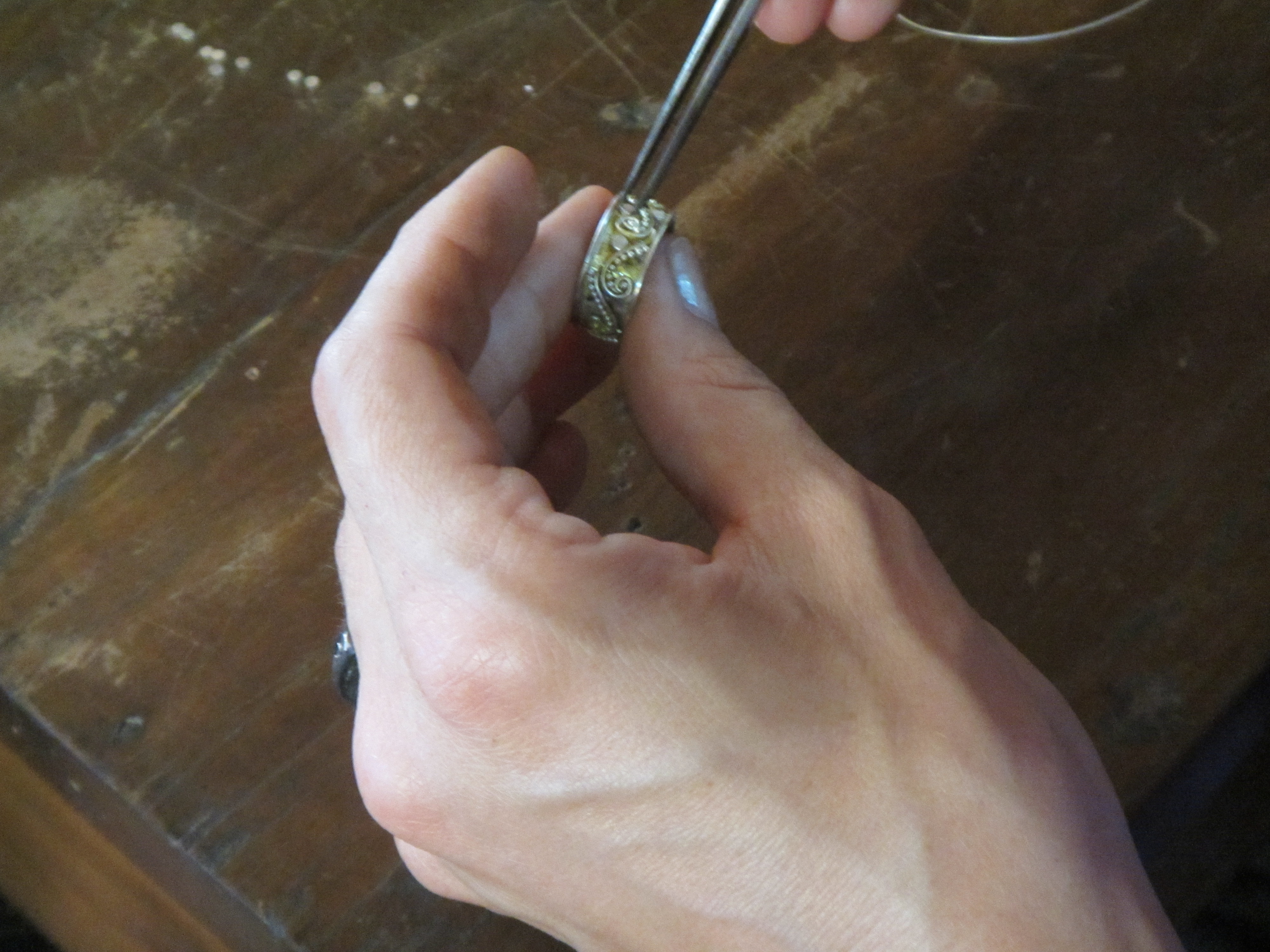 The Private Eye chose a beaded design with curls. To do this design, you take thin silver wire and bend it into the desired curls, then glue them to the face of the ring. Using tiny bits of glue, you then affix tiny silver beads; she also affixed some small disks.