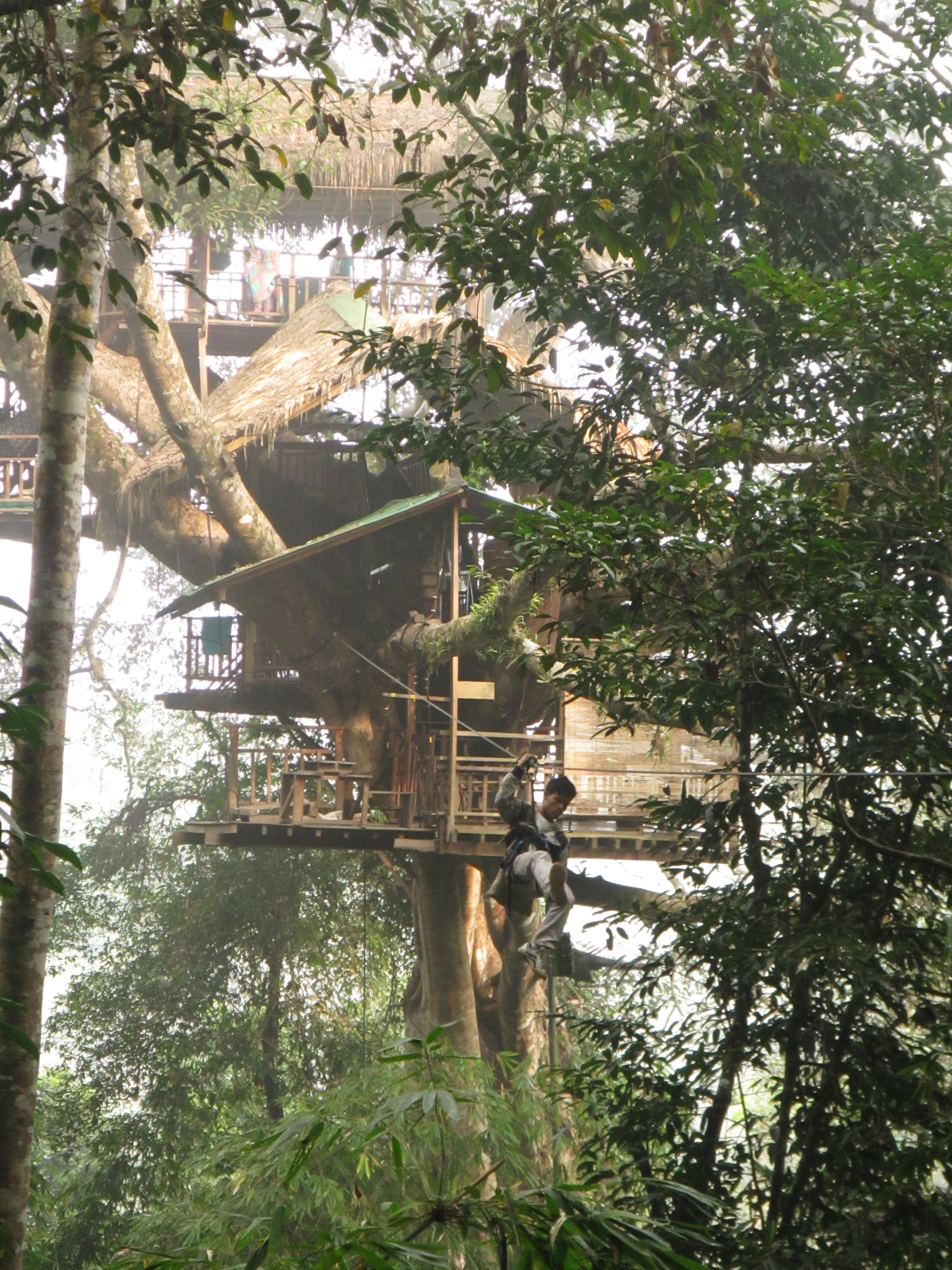Our treehouse was a marvel, both beautiful and functional, with a running cold shower, a sink, a toilet, clean water for drinking and bathing and tapestry tents to cover our mattresses, protecting us from both insects and their bat predators. We were brought nourishing meals of rice, vegetables, beans and a little meat, along with fresh strong coffee with condensed milk (our new drug of choice), tea, fruit and peanuts and peanut brittle. We had brought our own extra sweets and drinks. Here you can see our guide zip lining away from the treehouse.