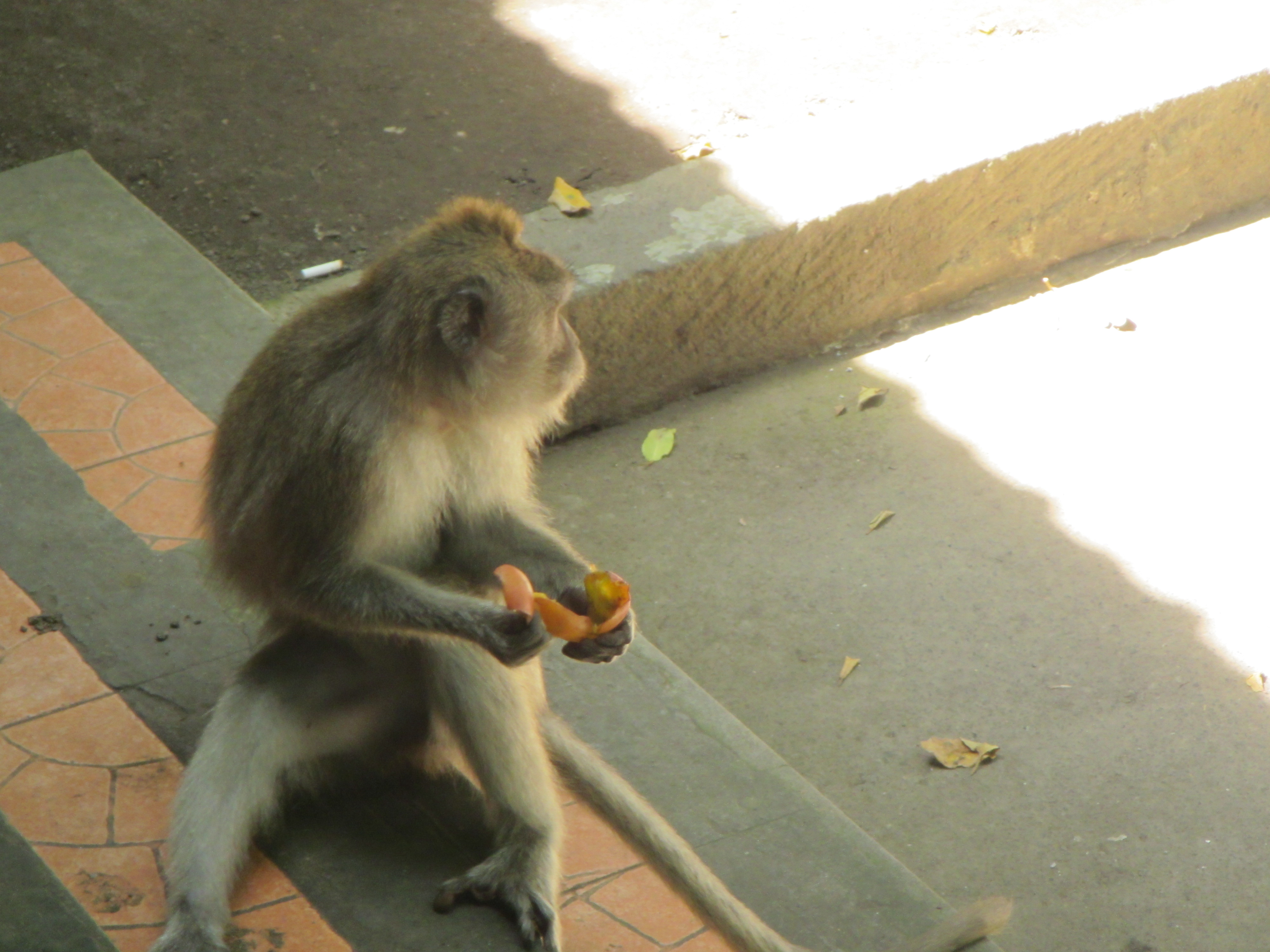 When we got back, we separated near the Art Teacher’s part of town, which is still busy but less frantic, near the Monkey Forest. We parted, and the Professor and I decided to find the studio of the artists we had met in the gallery on Hanuman Street. It turned out that the studio lay directly behind the sacred monkey forest, and that there is a “bike path” (scooter route) that leads there which follows the exterior fence of the forest. We saw plenty of monkeys on our walk, including a baby monkey that was so tiny, it had trouble managing its rambutan fruit.And we didn’t have to pay to go into the forest! And here are full-grown ones: