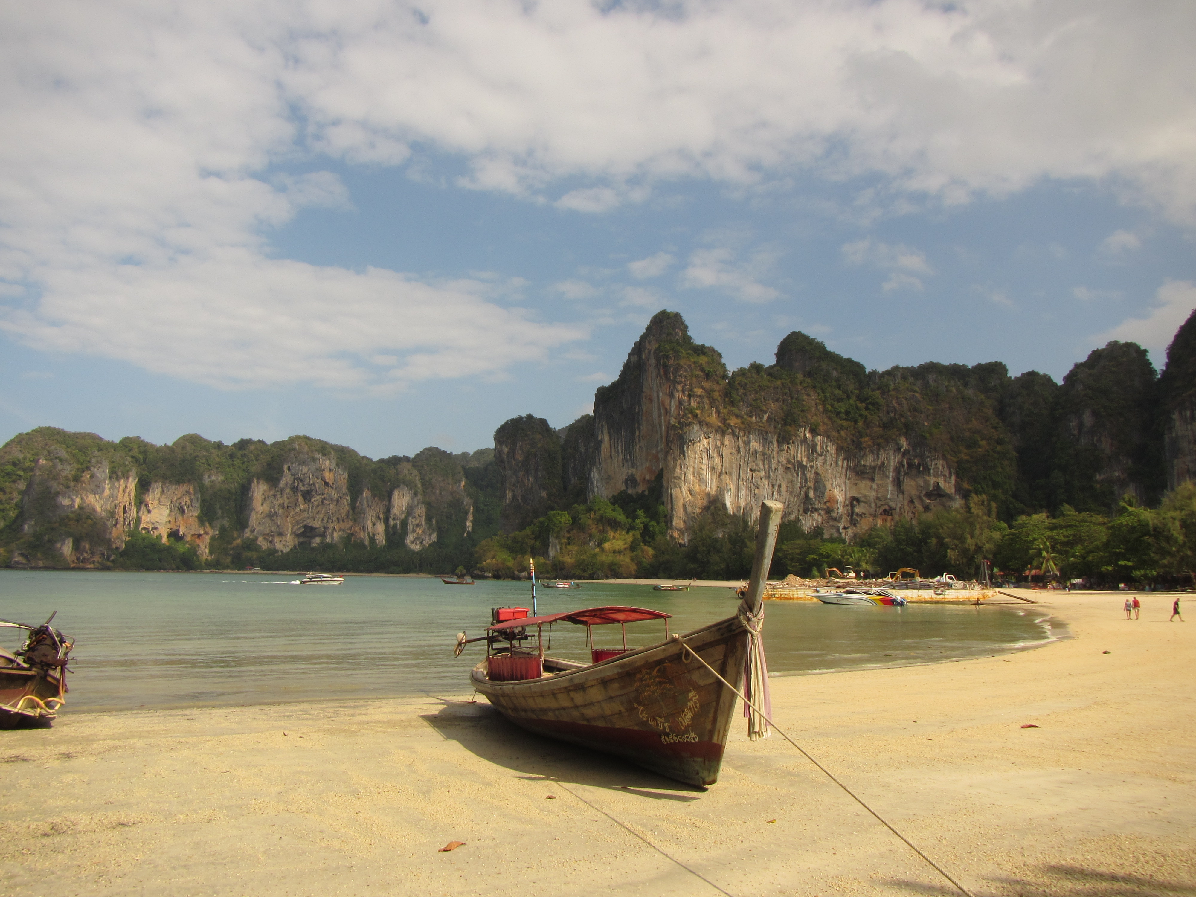 The notable feature of Krabi, Railay, and Ton Sai are karsts, dramatic limestone cliffs that jut into the sky. They are spectacularly beautiful, riddled with outcroppings, caves, and sheer faces of white, brown, cream, and grey stone. Their tops and some of their sides have trees and vines, giving contrast to the rock underneath. Some are inland, some rise out of the sea, and some are on the edge, surrounded by water at high tide and by sand or rocks at low tide. The Private Eye commented, as we approached Ton Sai on the longtail, that it might be the most beautiful place she has ever seen, vying with Yosemite.