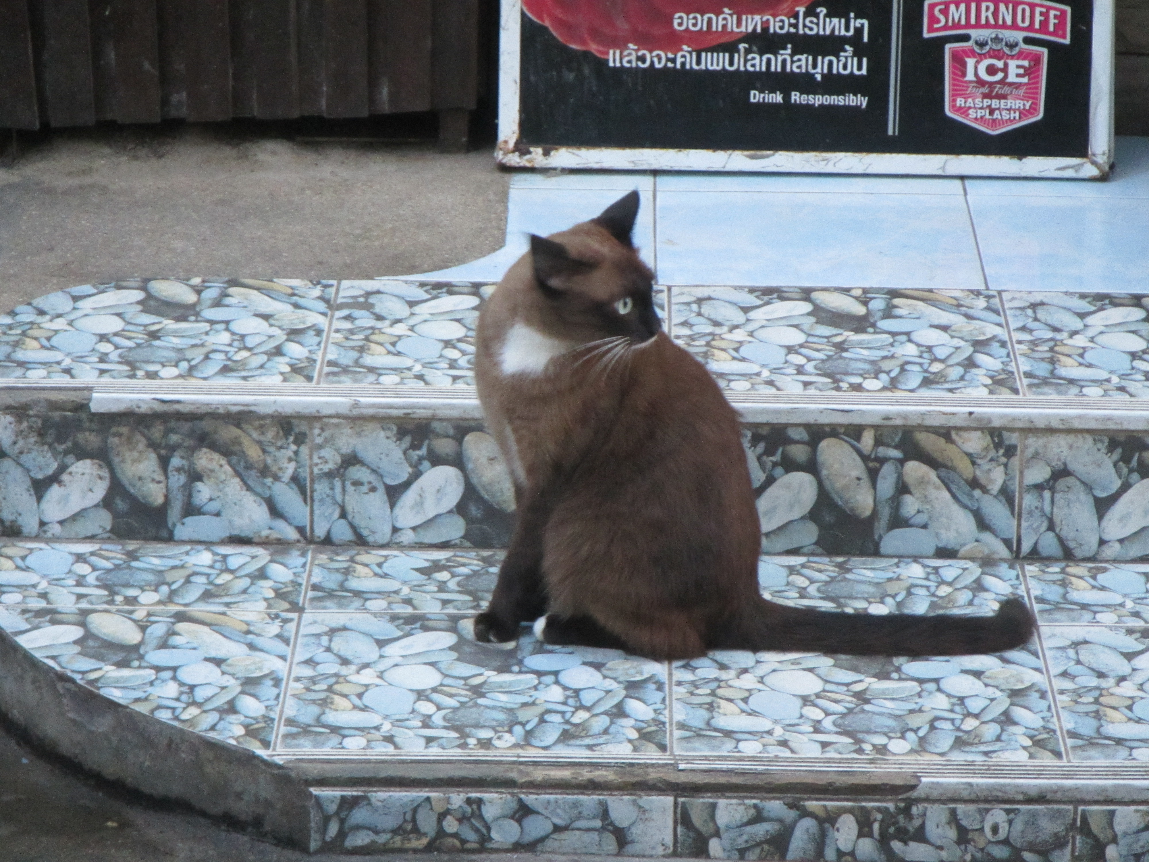 Here is where Lonely Planet is useful – it is good for helping you pick in which neighborhood to look for a room. I could tell when I read it that the beach places would be bad value near the harbor, and too expensive for our backpacker budget on the more remote parts of the island. I rented a bike and headed a few blocks down a dirt road leading away from the shore and into the village. Soon enough, I found two good lodgings right next to each other. I was tempted by the reasonably cool fan room in a relaxed guesthouse with a charismatic innkeeper who spoke great English. But I went with the place next door, where the same price got us a bungalow with a pretty outdoor bathroom, a lounge with cushions and mood lighting underneath the bungalow, a tv and DVD player, and a big open hangout area where we could meet other travelers. And for an extra $3 a day, air conditioning, which is nice because we have been sleeping badly. We have been trying to patronize the bar at the first place to help that good-spirited innkeeper, but it turns out it is closed for the season.