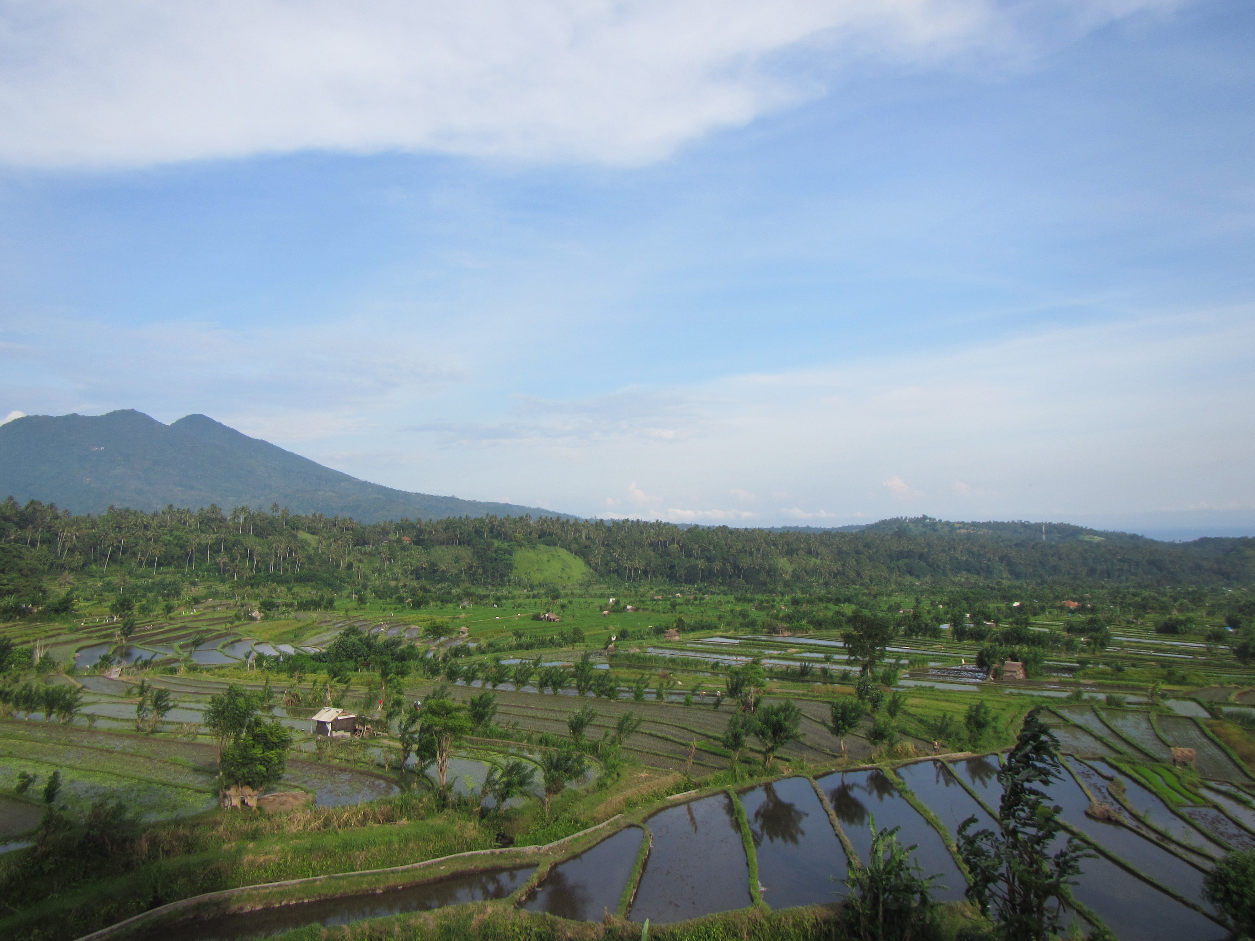 There is a solar array on the hill. They grow coffee here, and keep brown cows and assorted goats. We were followed by a loose pony while biking through the interior. There is a simple cemetery with wooden headstones near a coconut orchard. One one coast, you watch the clouds pile over the Rinjani volcano in Lombok. On the other coast, you watch the sun set beyond Bali, the light turning the clouds and the sea into pastel castles and liquid gold. Everyone turns out to watch these colors, whether at the downtempo bar, the acoustic guitar bar, or just along the sand.