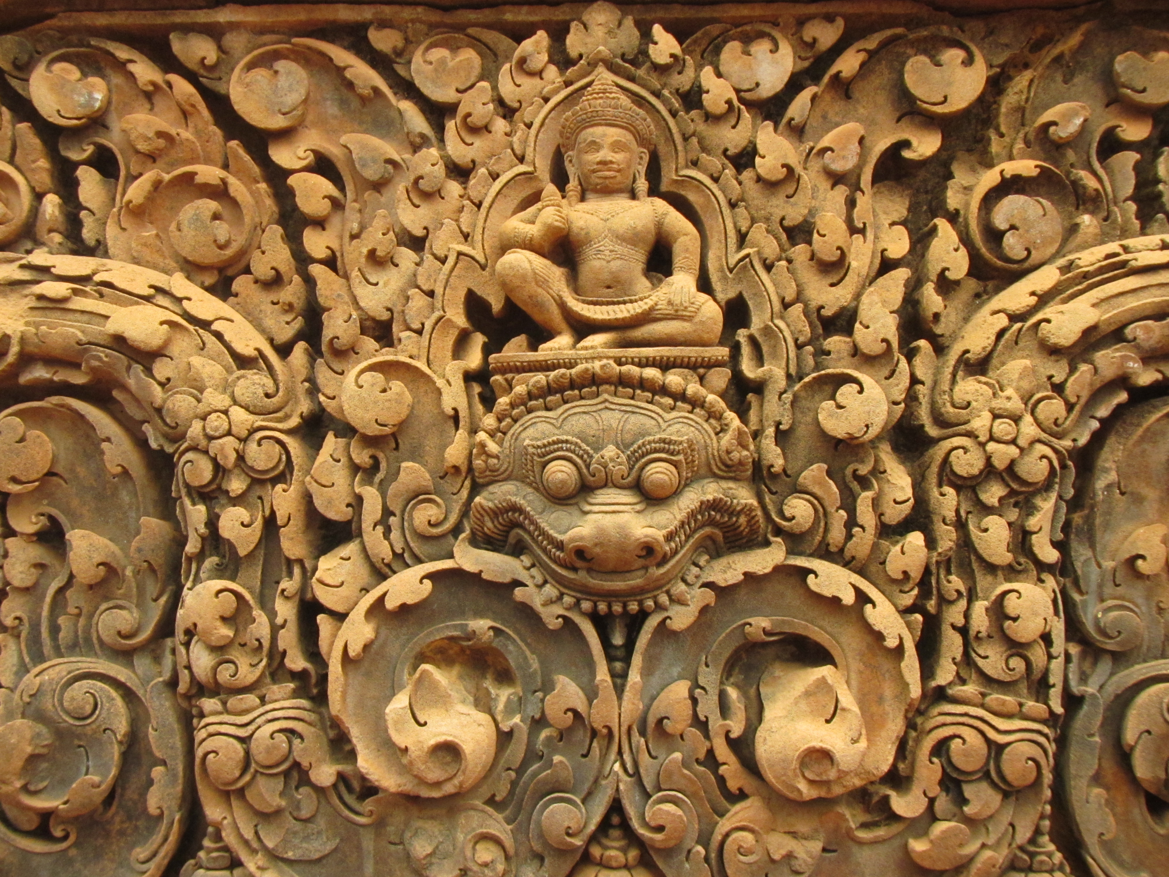 Yesterday, breaking from our usual habit of bicycling everywhere, we hired a tuk-tuk to take us to Banteay Srei, a Hindu temple carved of beautiful pink in sandstone In very intricate reliefs. Though a smaller temple, it was very much worth the trip. Each doorway featured a different scene from the Hindu religion, and they were NOT all the Ramayana. The flowers, the garlands, the apsaras, the monster faces, everything was just beautiful. And though it probably was not actually “built by ladies, no man’s hands could do that work”, we liked that it is presently called the Lady Temple anyway. It was not commissioned by the king, unlike the other temples – it was instead commissioned by an educated man, an advisor to the king, who clearly had wonderful taste. Apparently that particular pink sandstone is also better for carving than other stone.