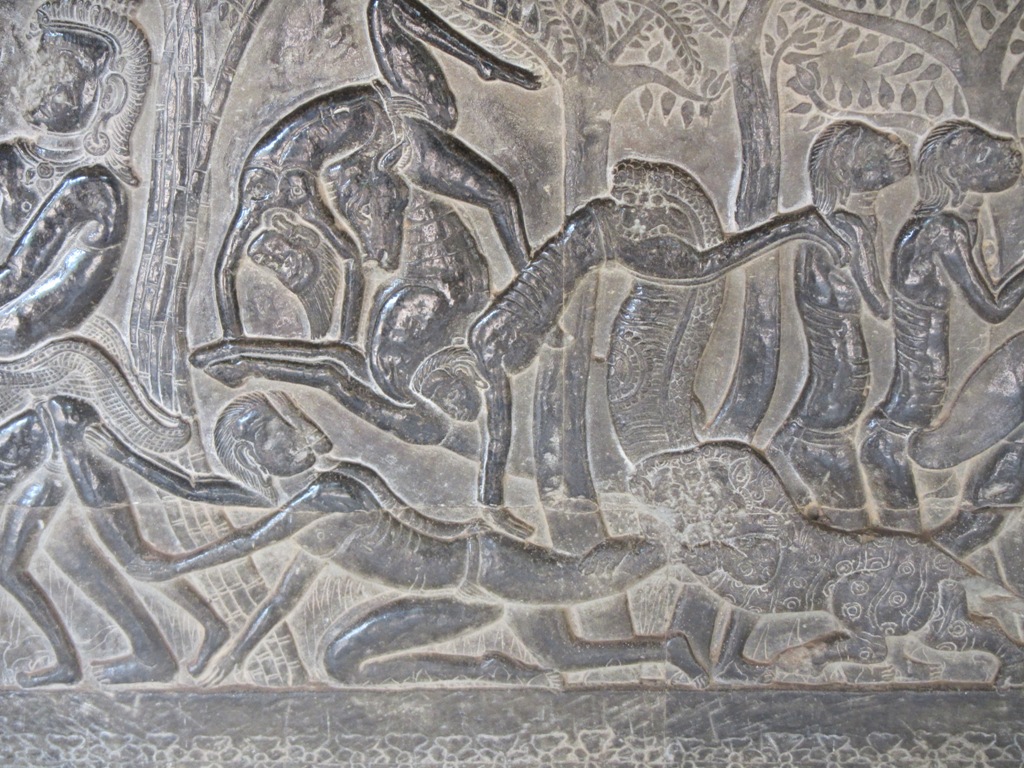 Not that that matters, of course. The building itself was awe-inspiring, a flaming mountain of stone covered with reliefs depicting stories ranging from the Ramayana to the Churning of the Ocean of Milk, a story as to how the gods and demons working together created the elixir of immortality. Additionally, there are endless reliefs of apsaras, beautiful dancing nymphs. We visited it twice, once at dawn when we watched the predawn light from a small, quiet structure with just a few other folks, and once in the late afternoon, when we climbed to the highest level and then descended and watched the clouds turn clear yellow over the walls from the eastern gate.