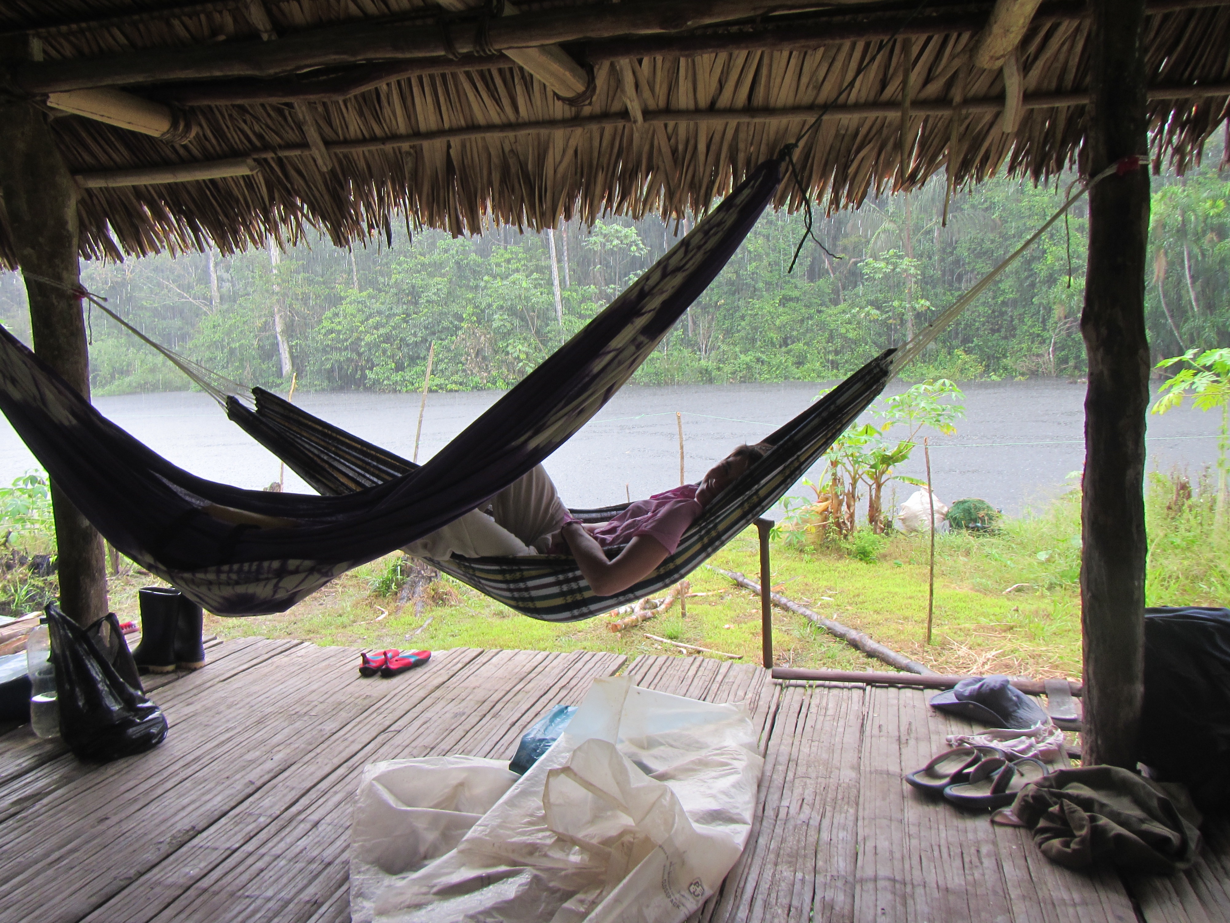 I came to like Jefe a fair bit as the ride continued. He had been guiding for some 15 years before he started his company some three years ago, at around the time his daughter was born. We all alternated talking and napping in our hammocks, swaying as the boat drifted downriver. At lunchtime, we were served rice and carrots and yucca and a little bit of chicken, the latter from more rubbery parts than I typically eat.